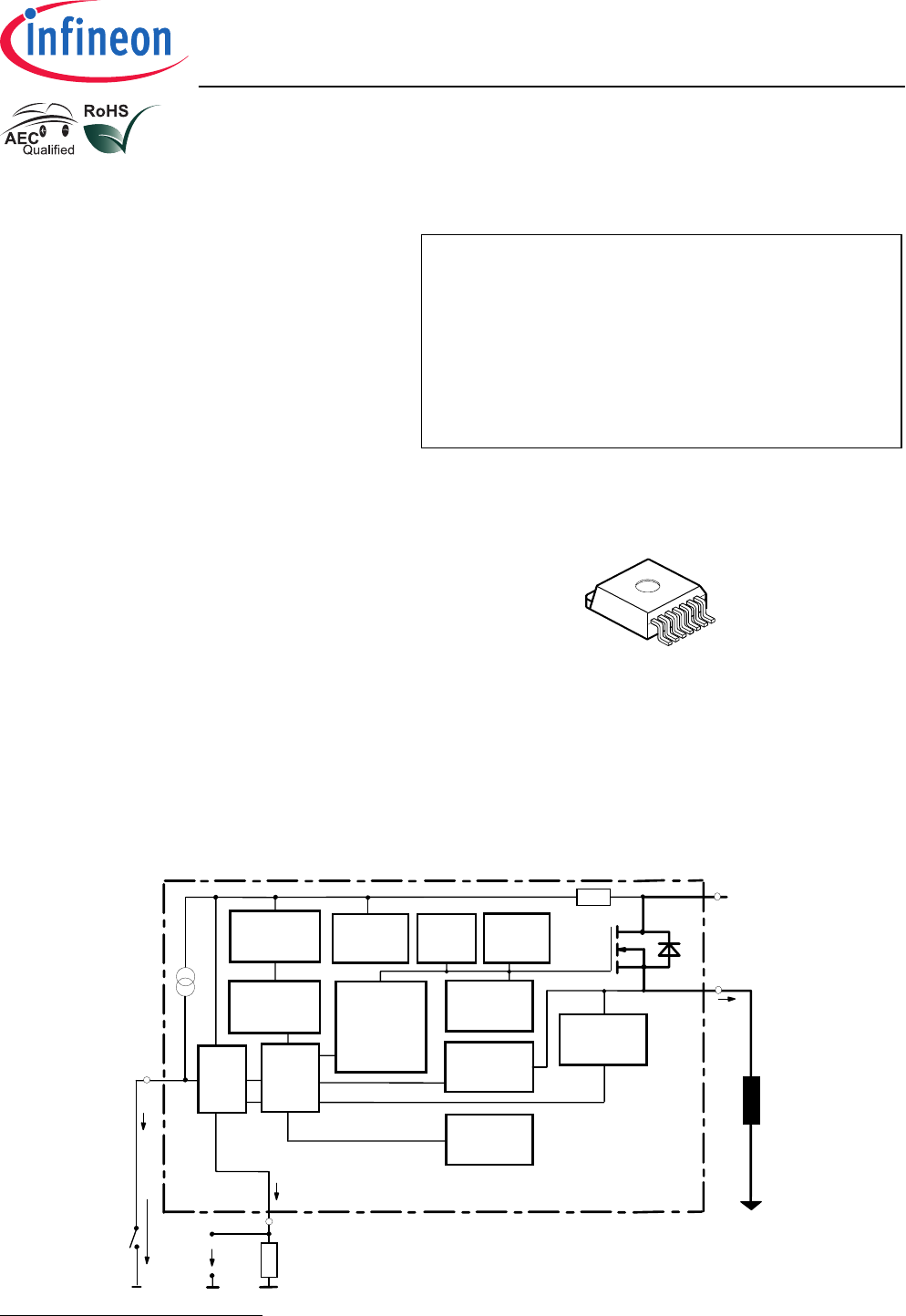Data Sheet BTS50085-1TMA Input circuit (ESD protection) Current sense status output V bb ZD V Vbb R bb R bb V Z,IS ZD Z,IN V bIN IS IN IIS I R IN V IN When the device is switched off (IIN = 0) the voltage between IN and GND reaches almost Vbb. Use a bipolar or MOS transistor with appropriate breakdown voltage as driver. VZ,IN = 74 V (typ). Short circuit detection Fault Condition: VON > VON(SC) (6 V typ.) and t> td(SC) (80 ...300 µs). VIS IS VZ,IS = 74 V (typ.