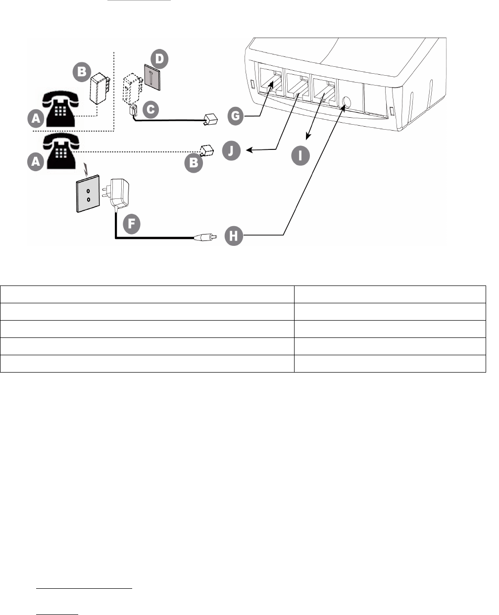 G = telephone network - port RJ11 (telephone cable 3m) H = power input - 2pole sockets 1 A