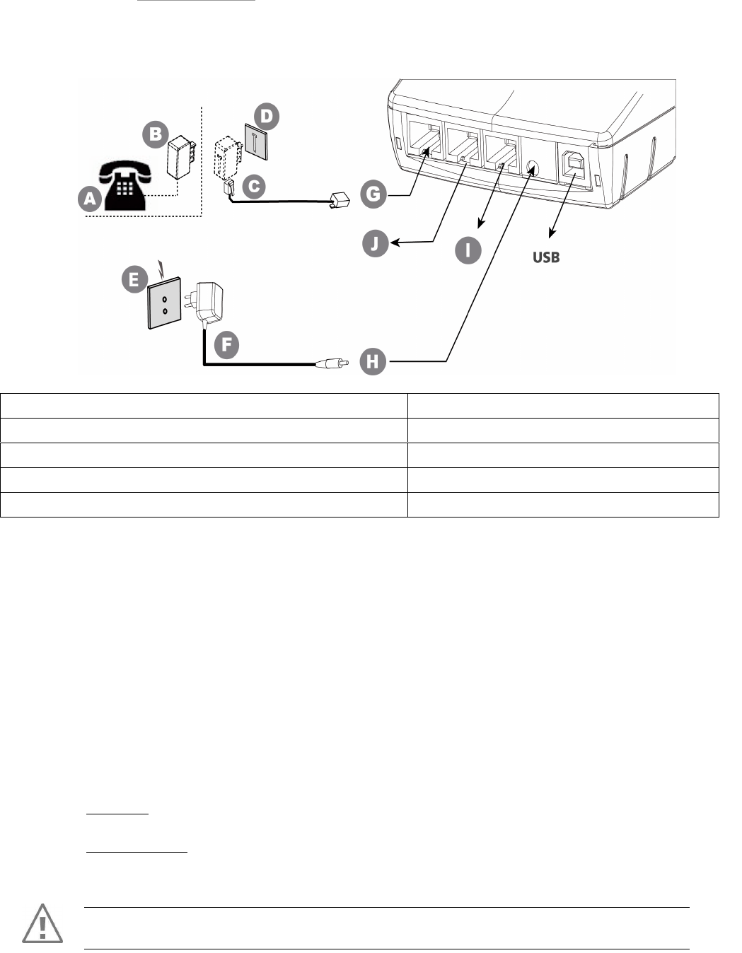 G = telephone network - port RJ11 (telephone cable 3m) H = power input - 2pole sockets 1 A