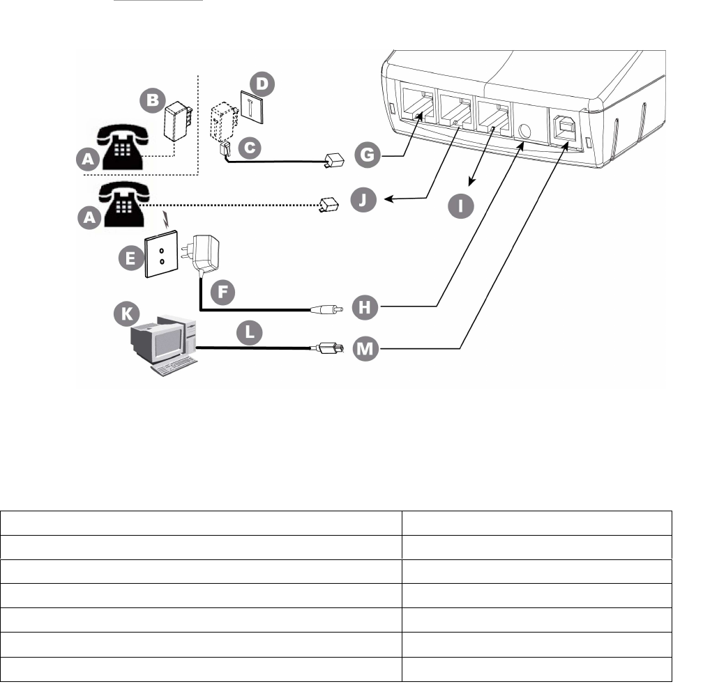 G = telephone network - port RJ11 (telephone cable 3m) H = power input - 2pole sockets 1 A