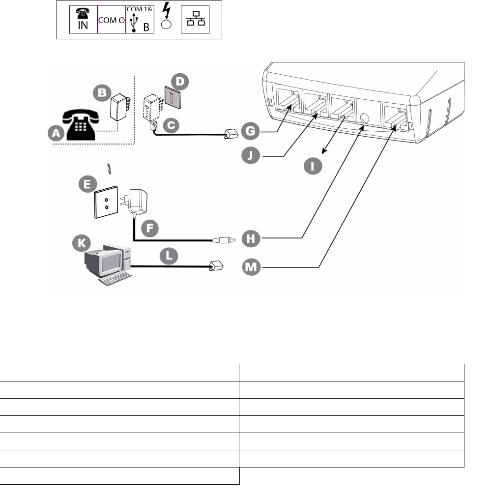 G = telephone network - port RJ11 (telephone cable 3m) H = power supply input - 2pole sockets 1 A