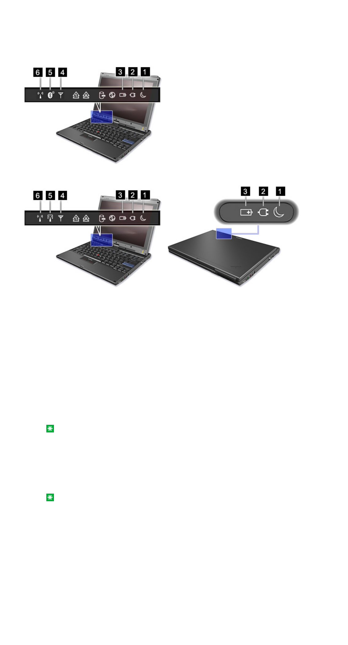The computer has status indicators that show the mode (sleep/standby, hibernation, or normal), AC power