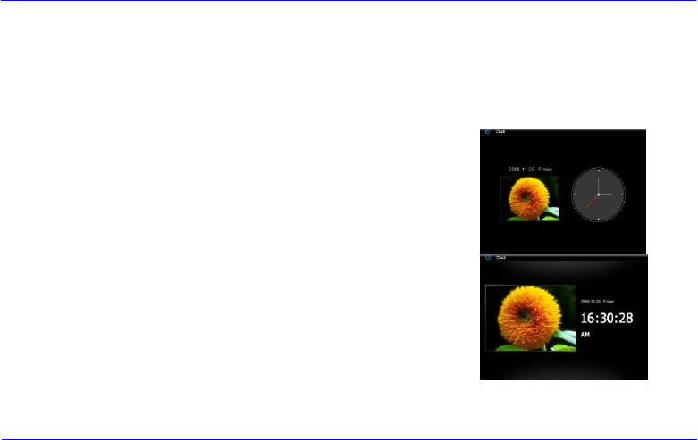En el modo reloj se muestra la fecha actual, la hora actual y al fondo una presentación con las imágenes disponibles.