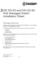 GE-DS-82 and GE-DS-82PoE Managed Switch Installation Sheet Package Contents Thank you for purchasing the Interlogix 8-Port Fast Ethernet + 2-Port Gigabit TP/SFP Combo Managed PoE Switch. The following Managed Switch model numbers are covered in this sheet: • GE-DS-82 • GE-DS-82-PoE Open the box of the Managed Switch and carefully unpack it.