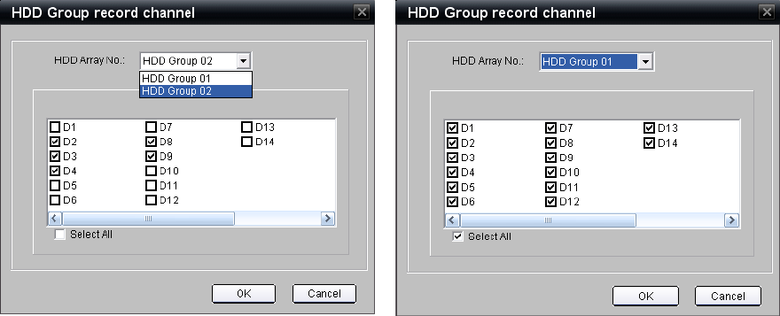 7. Select HDD Group 01 from the drop-down and check the cameras required