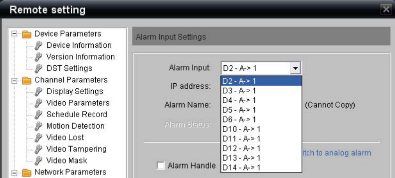 Alarm Input field shows an entry such as “D2 – A->1” which identifies that it is