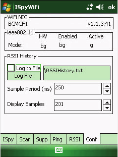 8 Tap the Conf tab to set up a log file that lists RSSI history.