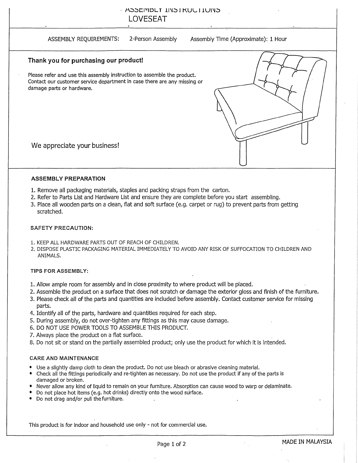 ABOMINABLY LD T RUL [ LEND LOVE SEAT ASSEMBLY REQUIREMENTS: 2-Person Assembly Assembly Time (Approximate): 1 Hour Thank you for purchasing our product! Please refer and use this assembly instruction to assemble the product, Contact our customer service department in case there are any missing or damage parts or hardware, We appreciate your business! ASSEMBLY PREPARATION 1. Remove all packaging materials, staples and packing straps from the carton, 2.