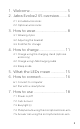 ENGLISH 1. Welcome .........................................5 2. Jabra Evolve2 65 overview.........6 2.1 Included accessories 2.2 Optional accessories 3. How to wear...................................8 3.1 Wearing styles 3.2 Adjusting the headset 3.3 Fold flat for storage 4. How to charge ............................ 11 4.1 Charge using the charging stand (optional accessory) 4.2 Charge using USB charging cable 4.3 Sleep mode 5. What the LEDs mean ............... 15 6. How to connect....................