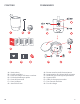 CONTENIDO CONTROLES AUX CHARGE AUX AUX AUX A – Altavoz B – Cable auxiliar ES CHARGE CHARGE CHARGE A – Botón de encendido/apagado, reproducción/pausa C – Cable de carga USB con envoltura de carrete B – Subir volumen/siguiente pista D – Guía de inicio rápido D – Indicador de luz LED E – Tarjeta de bienvenida E – Cable de carga y envoltura de carrete F – Tarjeta legal F – Puerto de entrada auxiliar G – Etiqueta de Jam G – Puerto de carga C – Bajar volumen/pista previa 16