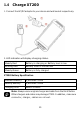 1.4 Charge XT200 1. Connect the AC/DC adaptor to your device and wall socket respectively. 2. LED indicator will display charging status. Steady Red Battery is charging or Battery level is low Blinking Red Battery level is critical low Steady Green Battery is fully charged XT200 Battery Specification Standard Battery 2,900mAh 3.85V Backup Battery 5,800mAh 3.85V Charging time About 5 hours Note: Always use an original charger and cable from the Point Mobile.