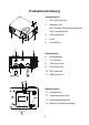 Produktbeschreibung Vorderansicht: 1. 2. EIN-/AUS-Schalter Indikator Licht Rot: Standby (Bereitschaftsbetrieb) Grün: betriebsbereit 3. Lüftungsfenster 4. Linse 5. Anschlüsse Rückansicht: 6. IR Empfänger 7. TV Anchluss 8. VGA Anschluss 9. Lüftungsfenster 10. SD Kartenslot 11. USB Anschluss Bodenansicht: 12. Lautsprecher 13. Trapezkorrektur-Rad 14. Höhenanpassungsfuß 15.