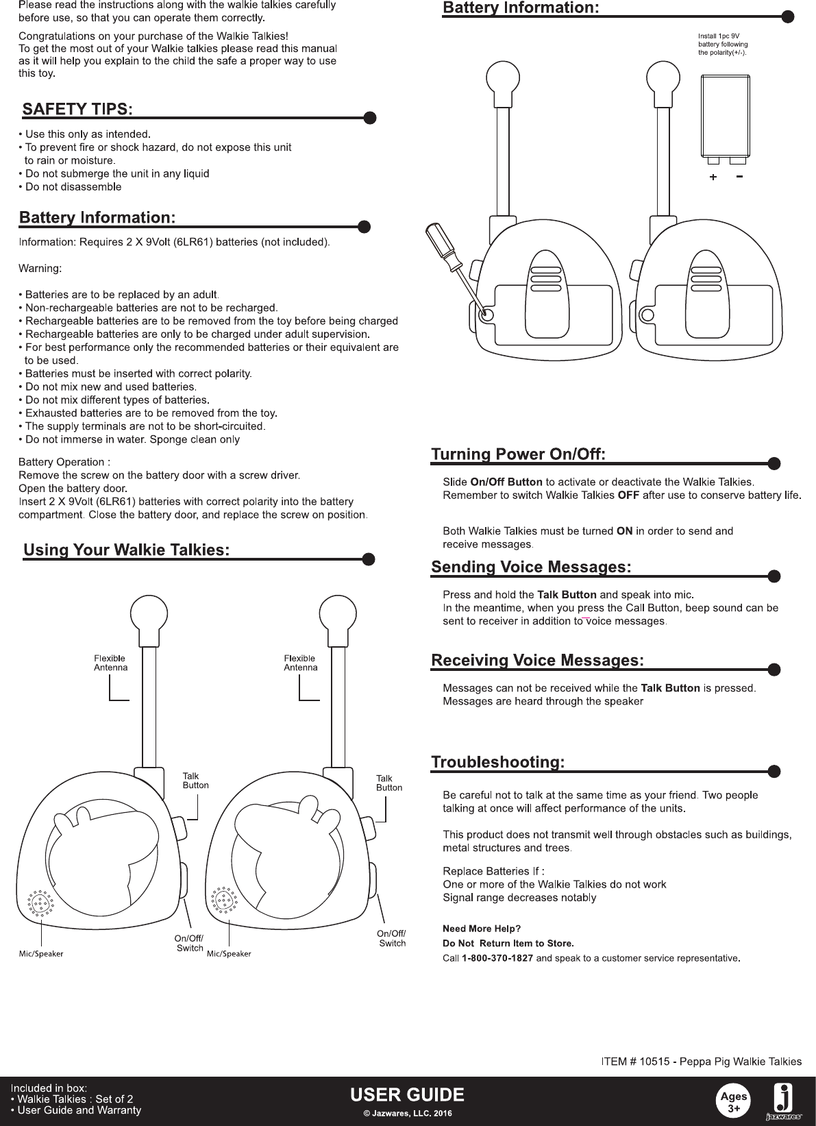 Please read the instructions along with the walkies talkies carefully before uss, so that you can operate them cogently. Ingratiation on your purchase of the Talkie Talkies! To get the most out of your Talkie talkies please read this manual a8 It will help you explain io the child the safe a proper way to use this tay SAFETY TIPS: @ » Usa this only as intended. » To prevent fire or shock hazard, do not expose this unit 16 rain or moisture.