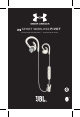 SPORT WIRELESS PIVOT Quick Start Guide Guide de démarrage rapide 繁體中文 1. 包裝盒內物品 充電線纜 線纜繫帶 襯衫卡扣 運動款貼合耳套和 Freebit 加固器 便攜袋、快速入門指南、安全說明書、保固卡、警告卡和 UA MapMyRun 12 個月資深 會員卡 2. 概述 2.1 按鈕及 LED TalkThru /環境感知 /語音助理 2.2 連接 3. 佩戴耳機 3.1 選擇耳套及 Freebit 加固器提供最安全的貼合及最佳的聲音密封效果。 預安裝 3.2 稍微傾斜地將耳塞插入耳朵,然後反向旋轉以鎖定到位。 3.3 提起耳環繞過耳朵後面。 3.4 佩戴在頸後。 3.5 運動時使用卡扣固定線纜。 必要時透過繫帶調節線纜長度。 4. BLUETOOTH 配對 4.1 開啟耳機。 4.2 若是第一次連接,耳機將在通電後自動進入配對模式。 4.3 連接至 Bluetooth 裝置。 選擇「UA | JBL Sport Wireless PIVOT」以連接 4.