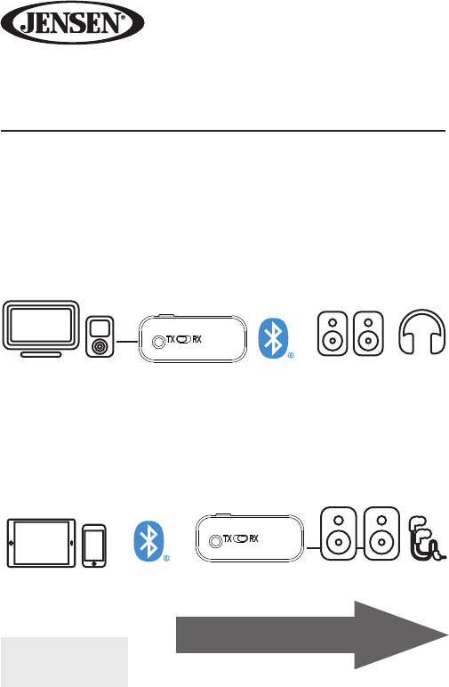wireless audio transmitter & receiver quick start guide Get ready for the ultimate flexibility with both wireless and wired audio sources and destinations! The following diagrams are just a few of the ways you can use it to get the most from your audio devices... Transmitter mode Connect the transmitter/receiver to your TV or MP3 player and listen to them wirelessly on Bluetooth speakers or headphones.
