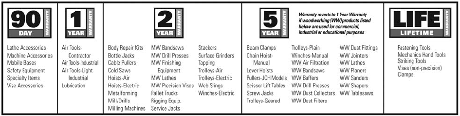 JET products carry a limited warranty which varies in duration based upon the product (MW = Metalworking, WW =