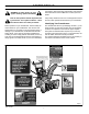 RULES FOR SAFE OPERATION DANGER DANGER Avoid death or serious injury from rotating auger. Keep hands, feet and clothing away. Unclogging discharge chute is a hazardous activity. Objects can be picked up by auger and thrown from chute. Never throw snow toward people or cars, and never allow anyone in front of the snow thrower. • Be aware of your enviroment while operating equipment.