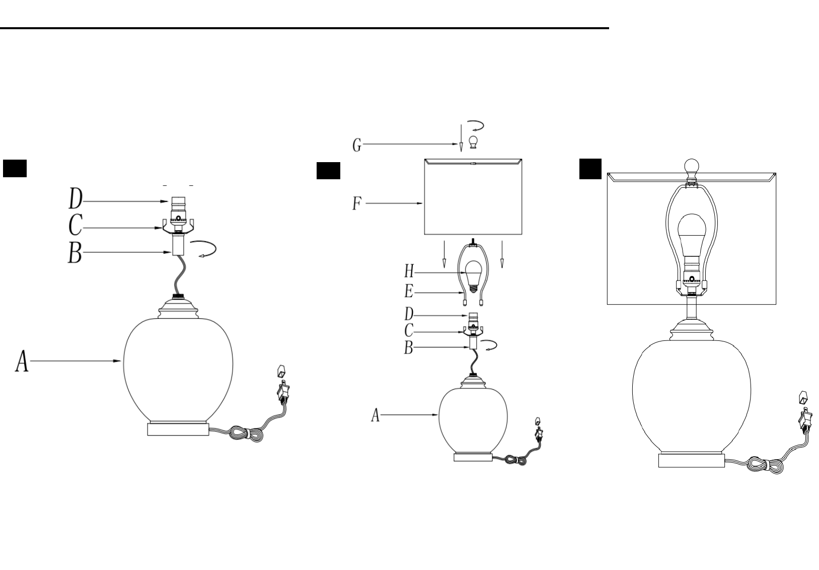 Screw the Neck (B) onto the Lamp base (A) Put the shade(F) on the Harp(E),then if everything is stable.