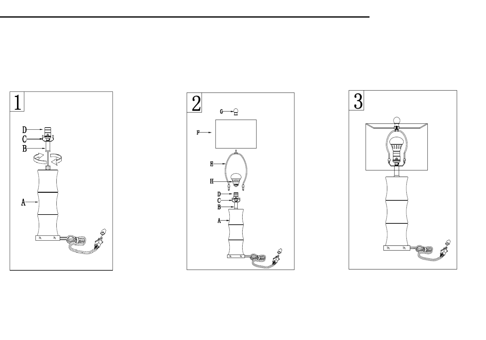 Screw the Neck (B) onto the Lamp base (A) Put the shade(F) on the Harp(E),then if everything is stable.