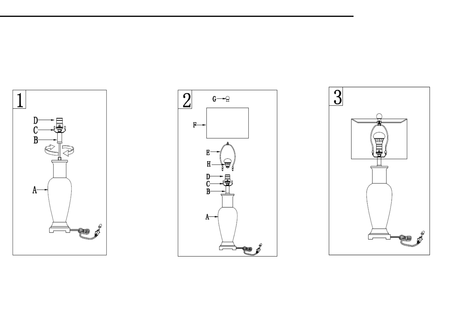 Screw the Neck (B) onto the Lamp base (A) Put the shade(F) on the Harp(E),then if everything is stable.