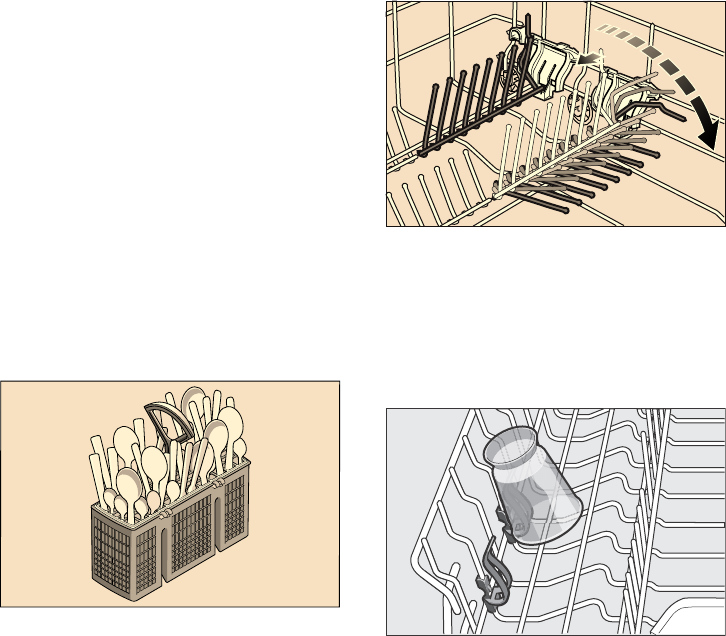 - ■ Messer und andere Utensilien mit scharfen Spitzen müssen im Besteckkorb mit den Spitzen nach unten oder in der Messerablage* in waagrechter Lage eingeordnet werden.