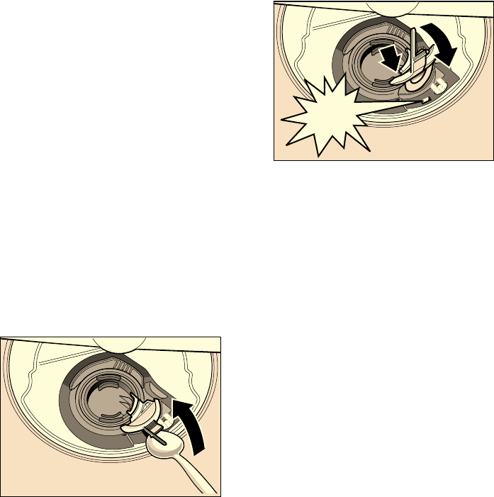 - 5. Weiße Pumpenabdeckung (wie abgebildet) mit Hilfe eines Löffels aushebeln. Die Abdeckung am Steg fassen und schräg nach innen anheben. Abdeckung komplett entnehmen.