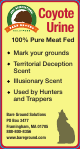 Coyote Urine 100% Pure Meat Fed Mark your grounds Territorial Deception Scent Illusionary Scent Used by Hunters and Trappers Bare Ground Solutions PO Box 3477 Framingham, MA 01705 888-800-8356 www.bareground.