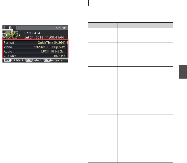 Metadata of the clip pointed by the cursor.