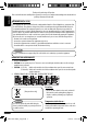 What appears to be trouble is not always serious. Check the following points before calling a service center. Symptoms MP3/WMA playback Disc playback FM/AM General ENGLISH Troubleshooting Remedies/Causes • Sound cannot be heard from the speakers. • Adjust the volume to the optimum level. • Check the cords and connections. • The unit does not work at all. Reset the unit (see page 3). • SSM automatic presetting does not work. Store stations manually. • Static noise while listening to the radio.