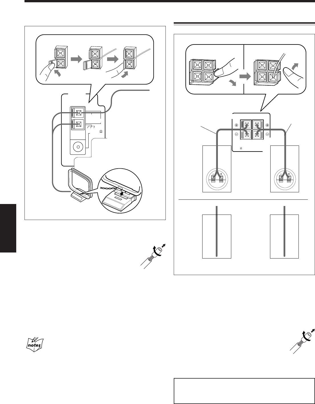 prises d’enceinte: (+) à (+) et (–) à (–).