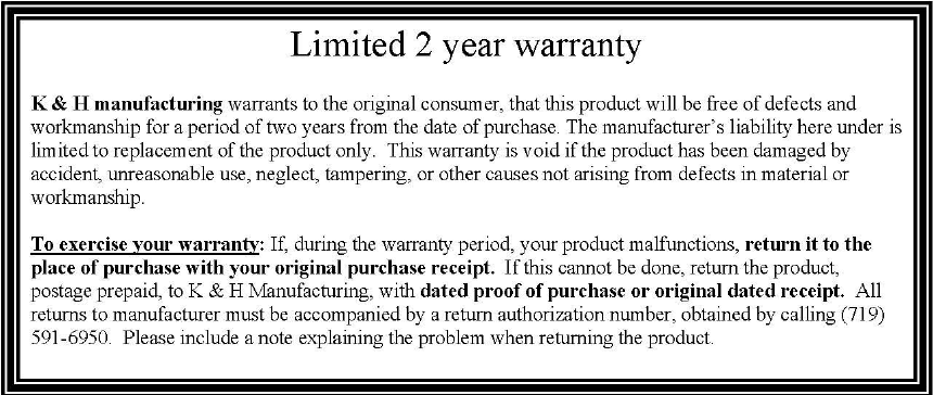 Our warranty is as follows: K&H Manufacturing warrants to the original consumer, that this