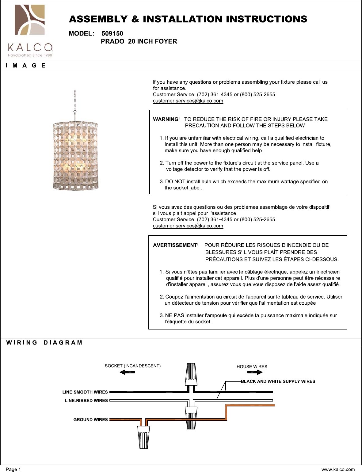 ALL O ASSEMBLY & INSTALLATION INSTRUCTIONS MODEL: 509150 PRADO 20 INCH FOYER PARTS LIST IMAGE PARTS NAME Qry X8 Parts Bag 1PC Screw PCS Threaded Nipple 1PC Star Washer 1PC Hex Nut PCs Canopy 1PC Open-tabla Chain PCS Chain (8ft) 1PC e Candle Cover §PCS Page 4 www.kalco.
