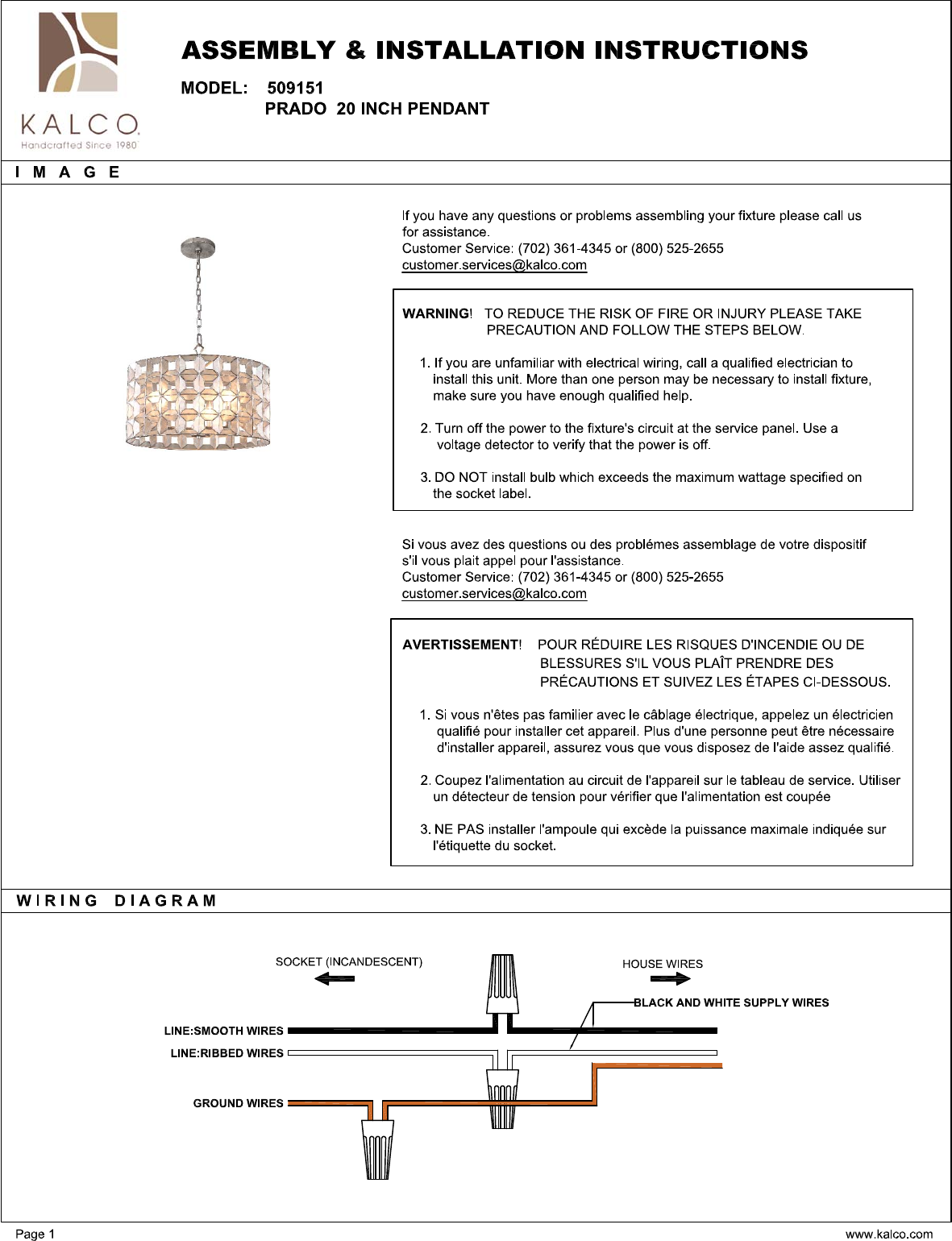 MODEL: 509151 PRADO 20 INCH FOYER ALL O ASSEMBLY & INSTALLATION INSTRUCTIONS PARTS LIST IMAGE PARTS NAME QTY 1PC X-9 Parts Bag Screw PCS 1PC Threads Nipple Star Washer 1PC Hex Nut PCs Canopy 1PC Open-able Chain PCS Chain {4ft } 1PC Candle Cover apes Page 4 www.kalco.