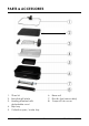 PARTS & ACCESSORIES 1. Glass lid 2. Nonstick grill plate 3. Heating element with detachable cord 4. Drip tray 5. Collection pan / water tray www.KALORIK.com 6. Base unit 7. Electric fan (removable) 8.