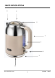 PARTS DESCRIPTION ENGLISH: 1. 2. 3. 4. Power base Handle Lid Handle Lid 5. 6. 7. 8. Water level indicator On/Off Switch Spout with scale filter Cord storage in base 6. 7. 8. Interruptor de encendido/apagado Boquilla con filtro Recoge-cable en la base 5. 6. 7. 8. Indicateur de niveau d’eau Bouton on/off Bec verseur avec filtre Range-câble dans la base ESPAÑOL: 1. 2. 3. 4. 5. Base Asa Manija de la tapa Tapa Indicador de nivel de aqua FRANÇAIS: 1. 2. 3. 4.
