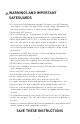 WARNINGS AND IMPORTANT SAFEGUARDS READ ALL INSTRUCTIONS • WARNING! This barbecue will become very hot. Do not move it during operation. • WARNING! Do not use indoors! • WARNING! Do not use alcohol, gasoline or other similar liquids to light or relight the barbecue. • WARNING! Keep children and pets away from grill at all times. Do NOT allow children to use grill. Close supervision is necessary when children or pets are in the area where grill is being used.