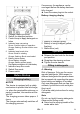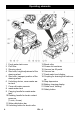Operating elements 1 2 3 4 5 6 7 8 9 10 11 12 8 Fresh water tank cover Fluff filter Steering wheel Star knob, height adjustment of the steering wheel Star knob, transport position of the steering wheel Unlocking device, cover waste water tank Cover dirt water reservoir waste water tank Carrying handle for waste water tank Rotating handle for brush contact pressure (1=min, 4=max) Water distribution bar Unlocking button for brush roller 13 14 15 16 17 18 19 20 21 22 EN – 6 Brush roller Coarse dirt conta