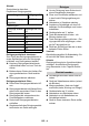 Wartungsvertrag Für einen zuverlässigen Betrieb des Gerätes können mit dem zuständigen KärcherVerkaufsbüro Wartungsverträge abgeschlossen werden. Hilfe bei Störungen Gefahr Verletzungsgefahr! Vor allen Arbeiten am Gerät Netzstecker ziehen. Vorsicht Beschädigungsfahr für das Gerät durch auslaufendes Wasser. Reinigungsmitteltank vor Arbeiten am Gerät abnehmen. Bei Störungen, die mit Hilfe dieser Tabelle nicht behoben werden können, Kundendienst rufen.