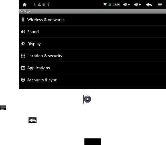 y From a Home screen or Application menu, tap Settings to enter setting interface. Or on the home screen, press Menu key or