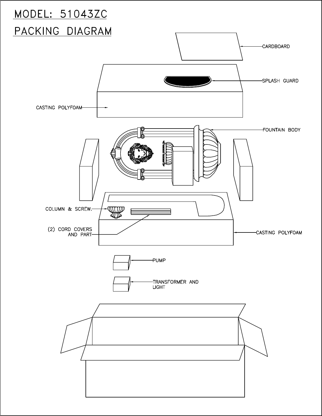 51043ZC Assembly Instructions WATER FEATURE warnings & Troubleshooting • Splashing may occur when the fountain is first turned on, protect surrounding surfaces as needed. Do not place the water feature on or near any surface that can be damaged by water. • Distilled water is recommended to reduce mineral deposits, bacteria build up and algae that may damage the water feature basin and pump. To reduce the risk of electrical shock, always disconnect the power supply before working with the water feature.