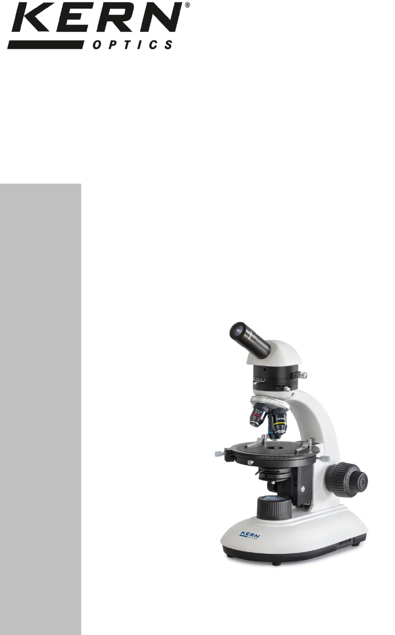 D KERN OPE-1 Version 1.0 01/2016 Betriebsanleitung Polarisationsmikroskop Inhaltsverzeichnis 1 Vor Gebrauch ............................................................................... 3 1.1 1.2 1.3 1.4 Allgemeine Hinweise ................................................................................................................ 3 Hinweise zur Elektrik................................................................................................................ 3 Aufbewahrung ................