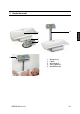 9.6 Montage Stativ (optional) Stativ mit den 4 Schrauben an der Waagenunterseite befestigen. Am Anzeigegerät die beiden seitlichen Gummipfropfen entfernen. Anzeigegerät mit den beiden schwarzen Drehknöpfen an der Halterung befestigen. Anzeigegerät mit den Drehknöpfen positionieren. 9.