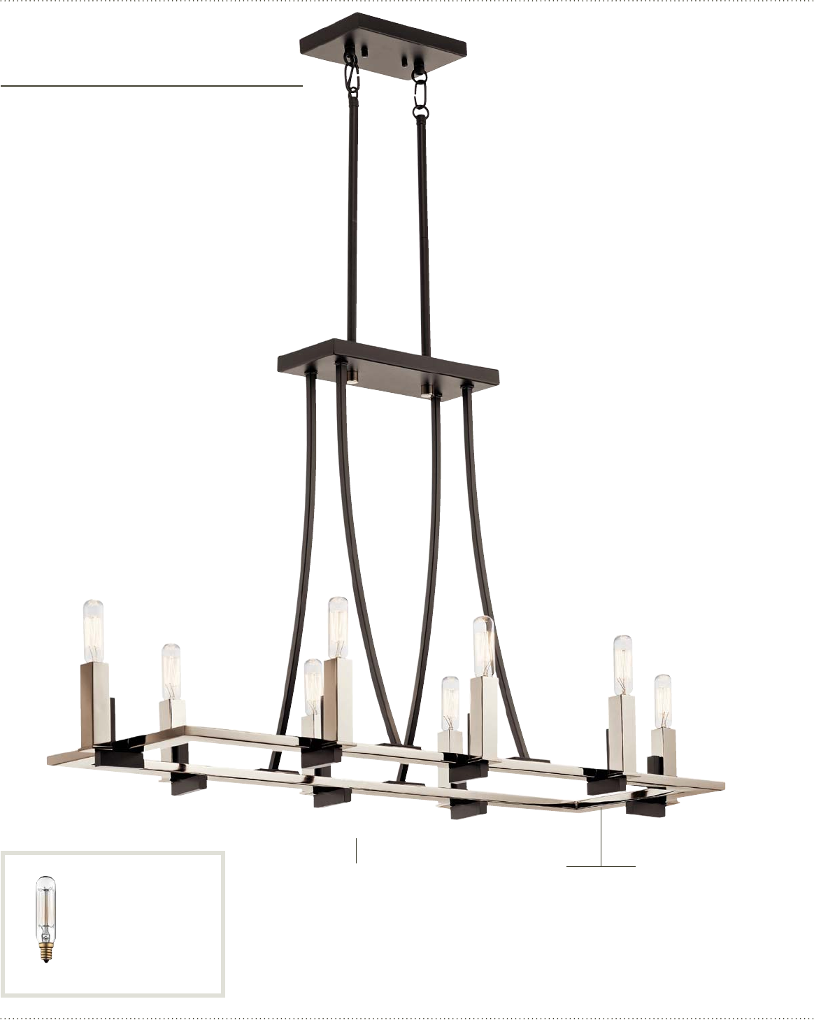 COLLECTIONS Satin Etched Cased Opal Glass C 43291 BK Chandelier B 43293 BK Flush Mount D 43290 BK Chandelier BENSIMONE™ ITEM # FINISH LIGHT SOURCE DIMENSIONS OVRLL. H EXTRA WIRE CHAIN/ STEM A 43292 BK (8) 60W (C) 14W x 22H x 36L 60 73 36 B 43293 BK (2) 75W (M) ❖ 15.25W x 5.25H --- --- --- C 43291 BK (8) 60W (C) 30W x 26H 64 87 36 Additional stem 2999 BK. Sloped ceiling kit included. D 43290 BK (6) 60W (C) 24W x 23.25H 61 53 36 Additional stem 2999 BK.