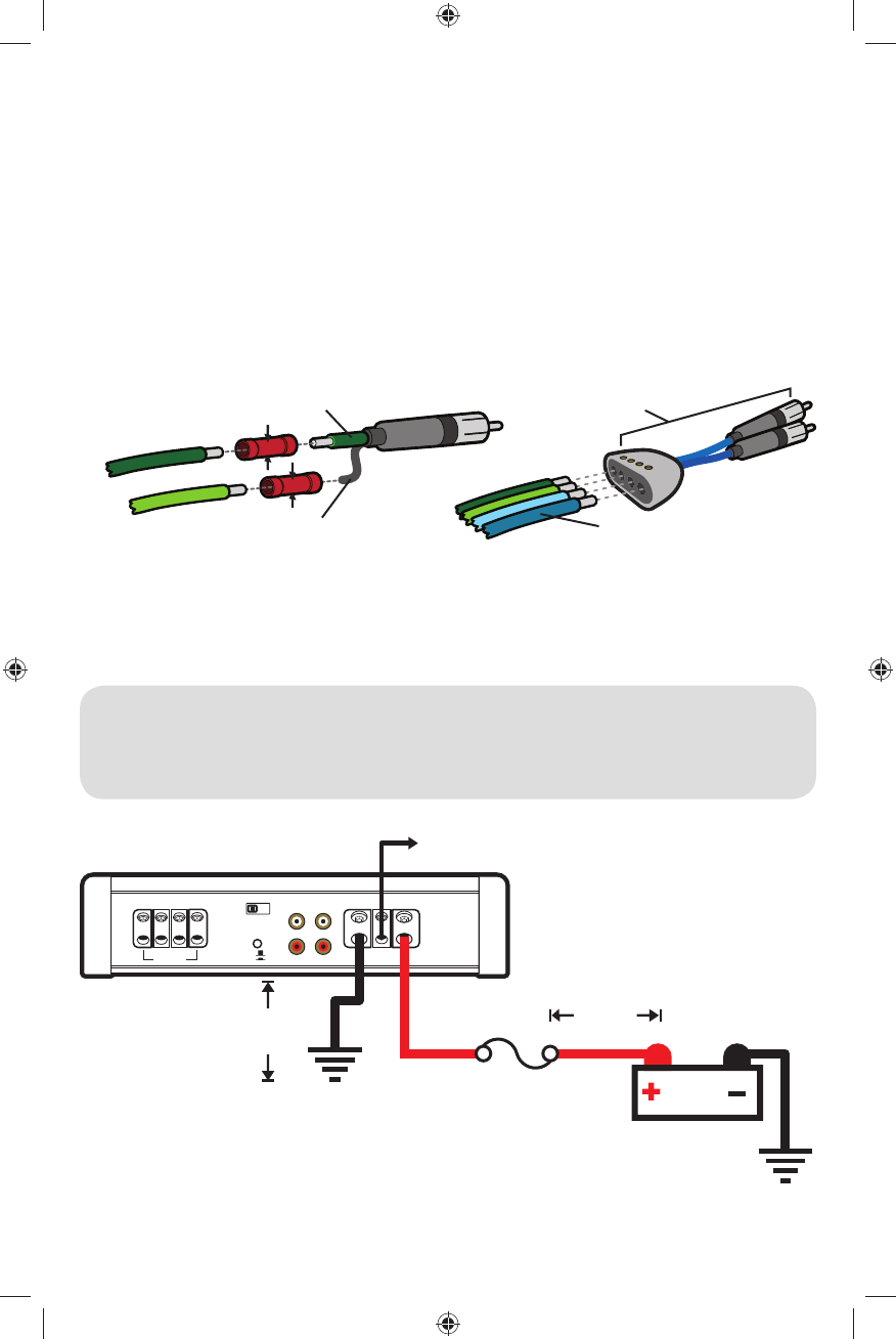 Install a fuse within 18” (45cm) of the battery and in-line with the power cable connected to your amplifi er. Install