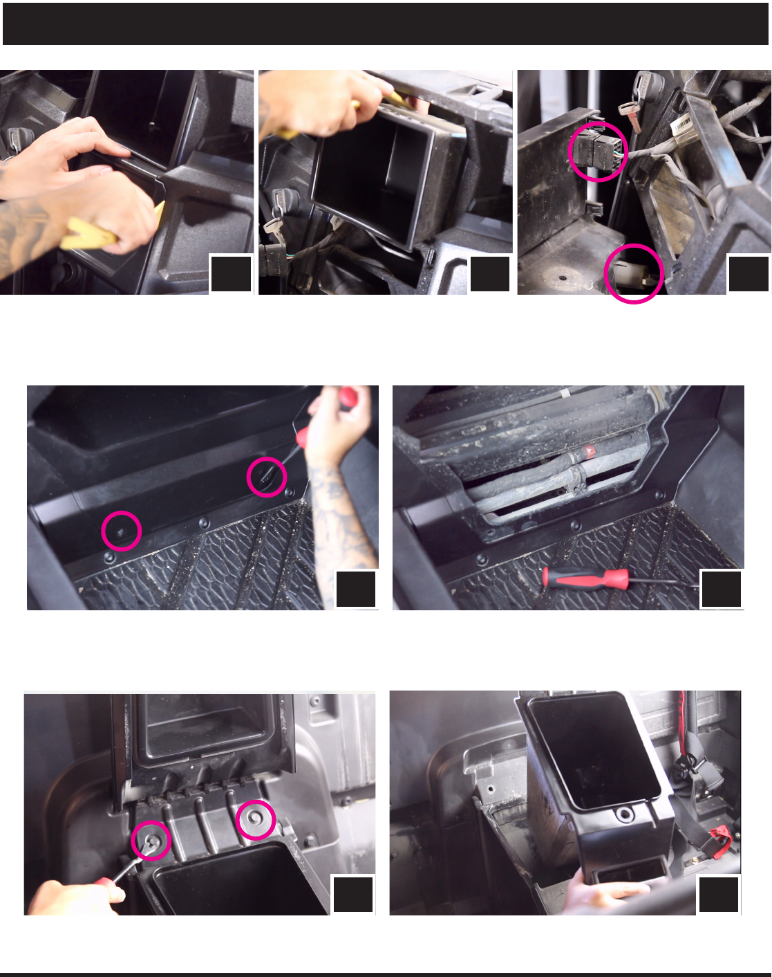 G. Use a panel removal tool to remove the center dash panel and center pocket. Disconnect all harness connectors attached to the center dash panel.