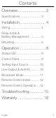 Contents Overview ........................ 2 Specifications ........................ 3 Installation ...................... 4 Wiring ................................... 4 Relay Install & Battery Management ............. 5 Mounting............................... 6 Operation ....................... 8 Status LED ............................ 8 Control Panel ........................ 9 Setting Input Source ............ 10 Line Output & AUX IN .......... 10 Broadcast Mode .................