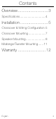 Contents Overview .......................... 3 Specifications ............................. 4 Installation ........................ 5 Crossover & Wiring Configuration 5 Crossover Mounting ................... 7 Speaker Mounting ...................... 8 Midrange/Tweeter Mounting ...... 11 Warranty ........................