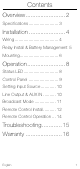 Contents Overview ........................ 2 Specifications ........................ 3 Installation ...................... 4 Wiring ................................... 4 Relay Install & Battery Management 5 Mounting............................... 6 Operation ....................... 8 Status LED ............................ 8 Control Panel ........................ 9 Setting Input Source ............ 10 Line Output & AUX IN .......... 10 Broadcast Mode ................. 11 Remote Control Install ..........