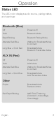 Operation Status LED The LED color displays audio source, pairing status, and warnings: Bluetooth (Blue) Off Power is off Solid Bluetooth Mode Rapid Blinking Bluetooth Pairing Mode Alternate Red/Blue Waiting for Broadcast Mode to connect Long Blue + Short Red Broadcast Mode Bluetooth Transmitter Active AUX IN (Red) Off Power is off Solid AUX Mode Alternate Red/Blue Waiting for Broadcast Mode to connect Long Red + Short Blue Broadcast Mode AUX Transmitter Active Other Purple Broadcast Mod