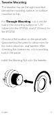Tweeter Mounting The tweeter may be through-mounted behind the mounting surface, or surfacemounted on top. For Through-Mounting, cut a circular hole in the mounting surface at 1.75” (45mm) for the ST3TW, and 2” (50mm) for the ST4TW. Choose a flat location on the panel with space behind the panel to allow room for the motor structure, and tweeter. After checking the clearances, cut a mounting hole in the panel. Install the Backing Nut onto the tweeter.